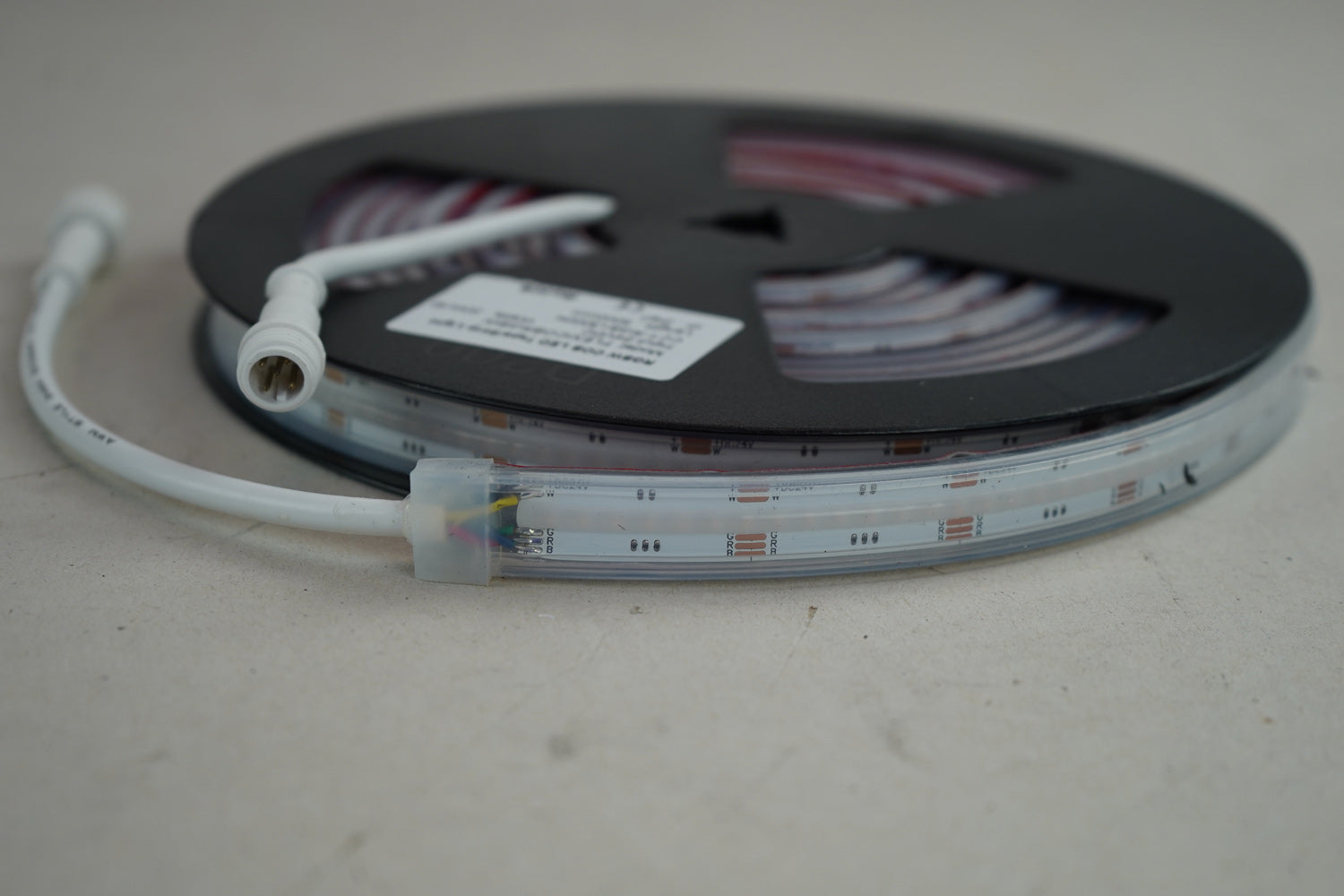 FLEXICOBRGBW is a 5-metre roll of Red, Blue, Green, White (RGBW) LED Tape featuring COB LEDs spaced 2.5mm apart. The tape has IP67 rating and suitable for outdoor applications. It has fitted connectors for easy and fast set up with no wiring, double-sided tape for easy affixing to services and for odd lengths, the flex tape is able to be cut every 25mm.