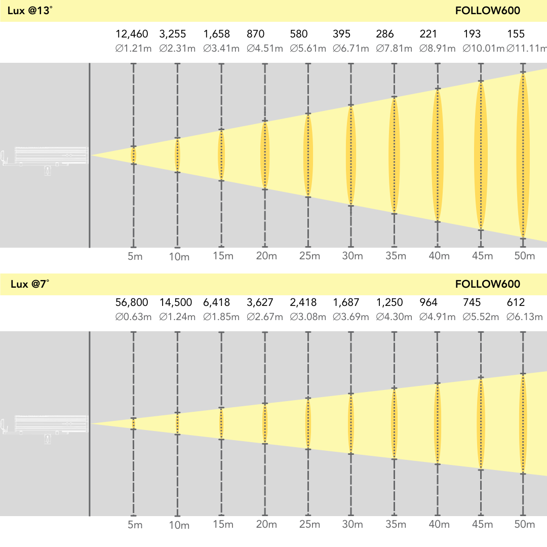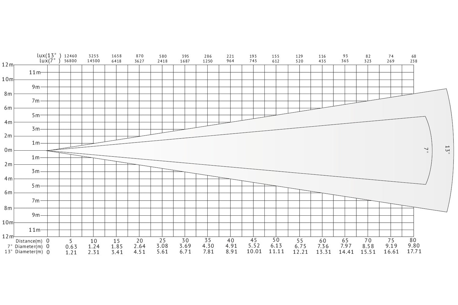 - Output: 56,800 lux @ 5m @ 7°; 12,460 lux @5m @ 13°
