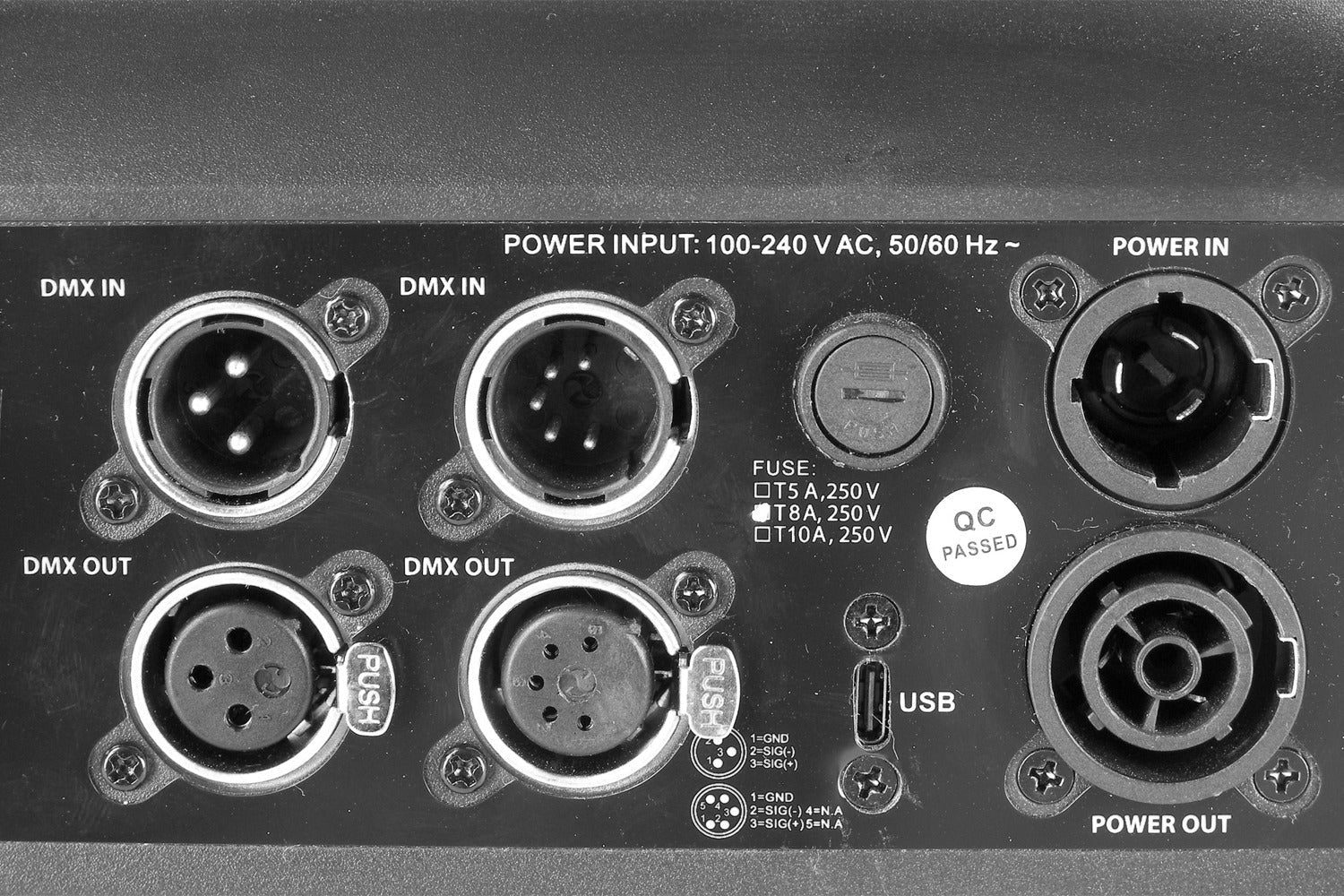 - Control Interface: 3-pin DMX in/out, 5-pin DMX in/out