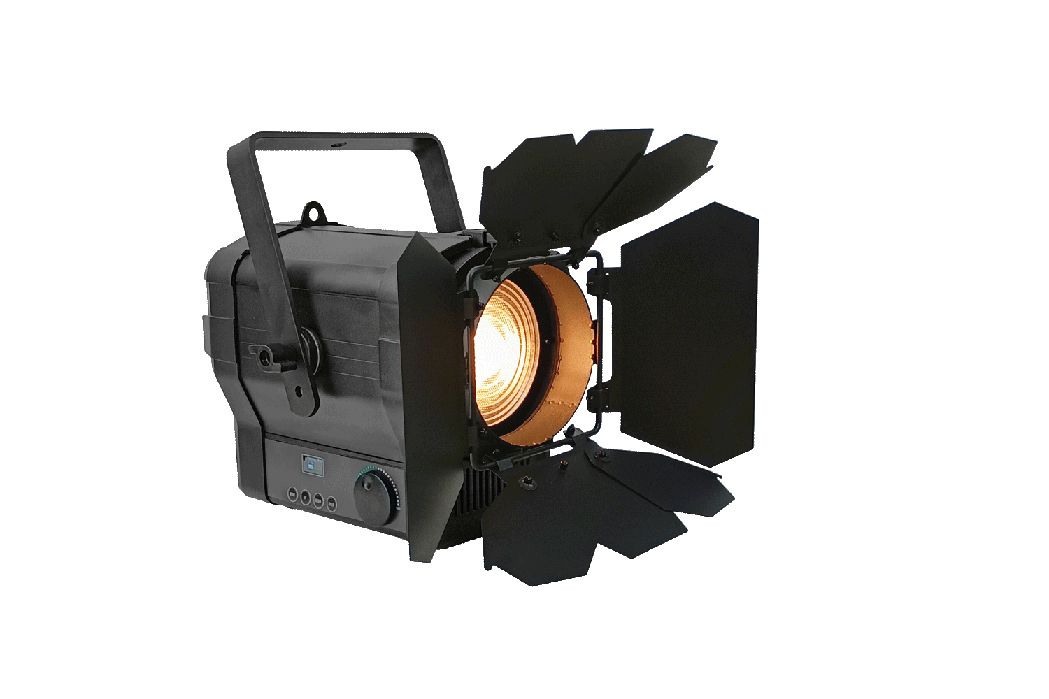 Opera Compact Series Fresnel with 100W COB Variable White LED Engine, 3200-5600K, 14-55° Manual Zoom, True1 in/out, 5 pin DMX in/out, includes gel frame & 8 leaf barn door