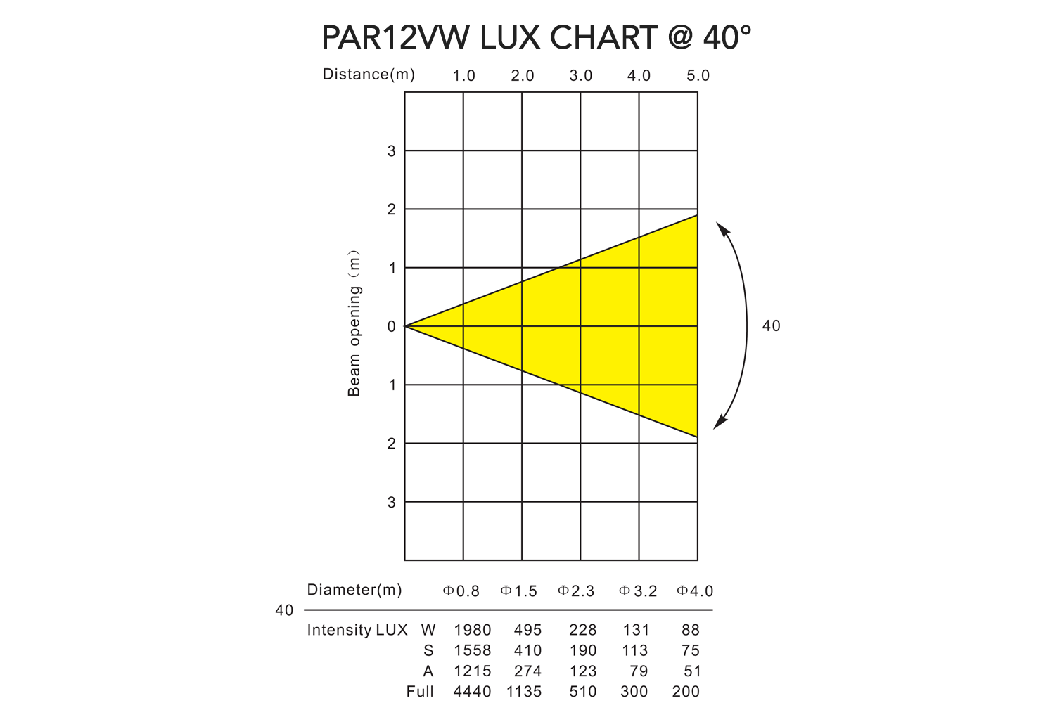 The Event Lighting PAR12VW is a powerful and versatile LED Pro Parcan. With 12 x 16W CW/WW/A LEDs, it delivers Cool White, Warm White and Amber to provide the right atmosphere for any occasion. With 5 x 16-bit Dimming Curves and adjustable strobe settings ranging from 1 to 30Hz, you have full control over your lighting effects. Enjoy customisable beam angles with options for 30˚, 40˚, 25˚ and 15˚, providing the perfect spread for any application. Experience 3,270 lux output at 2.0 meters, ensuring vibrant illumination in any setting. Boasting a robust lifespan of 50,000 hours, this fixture is built to last.
