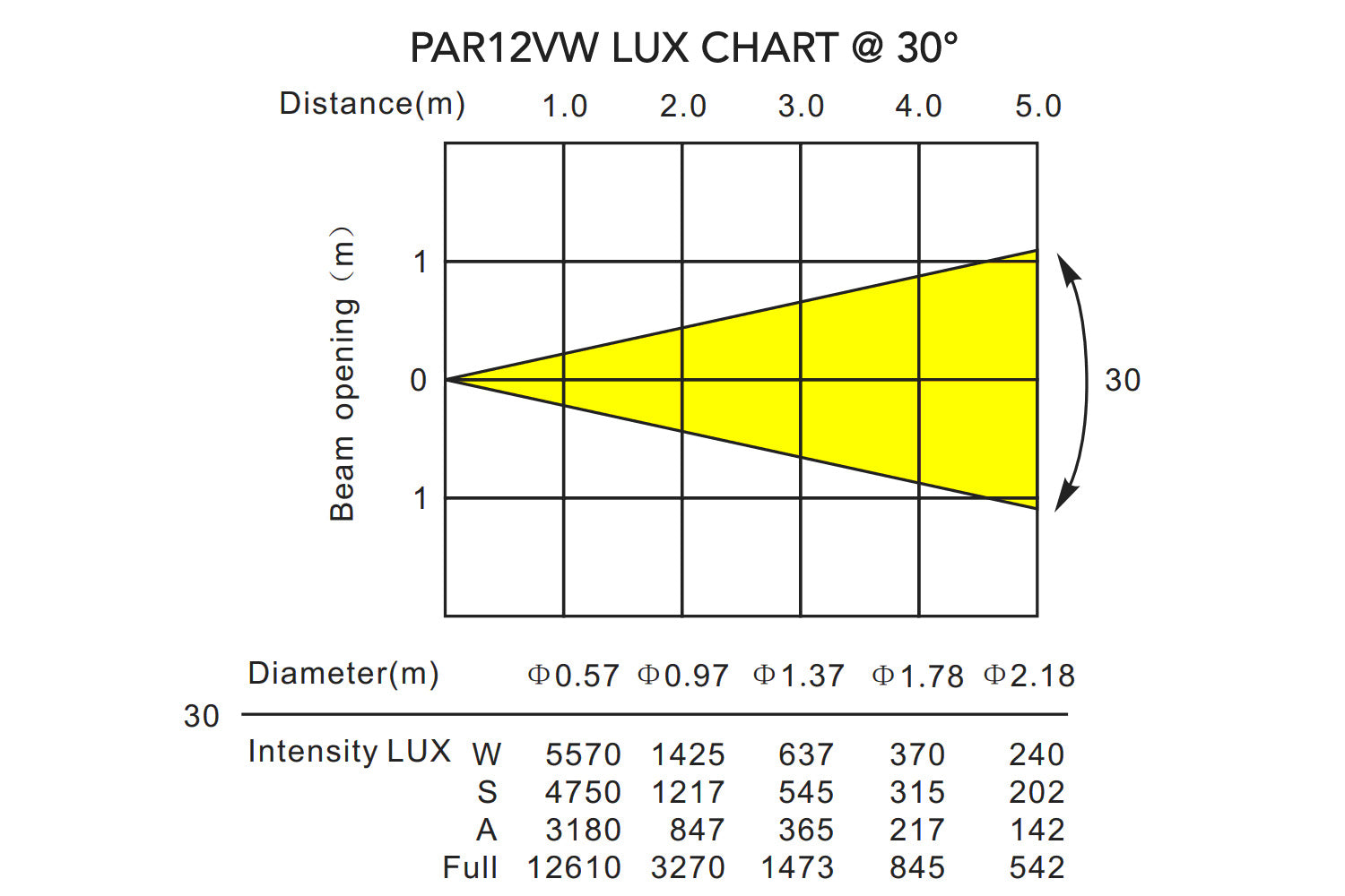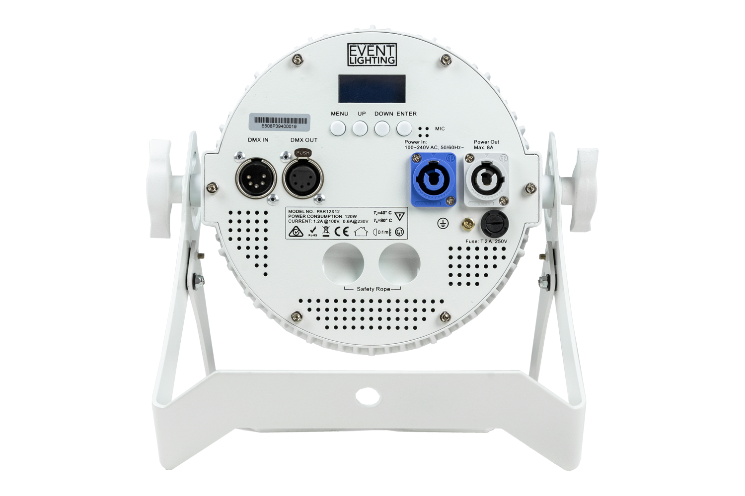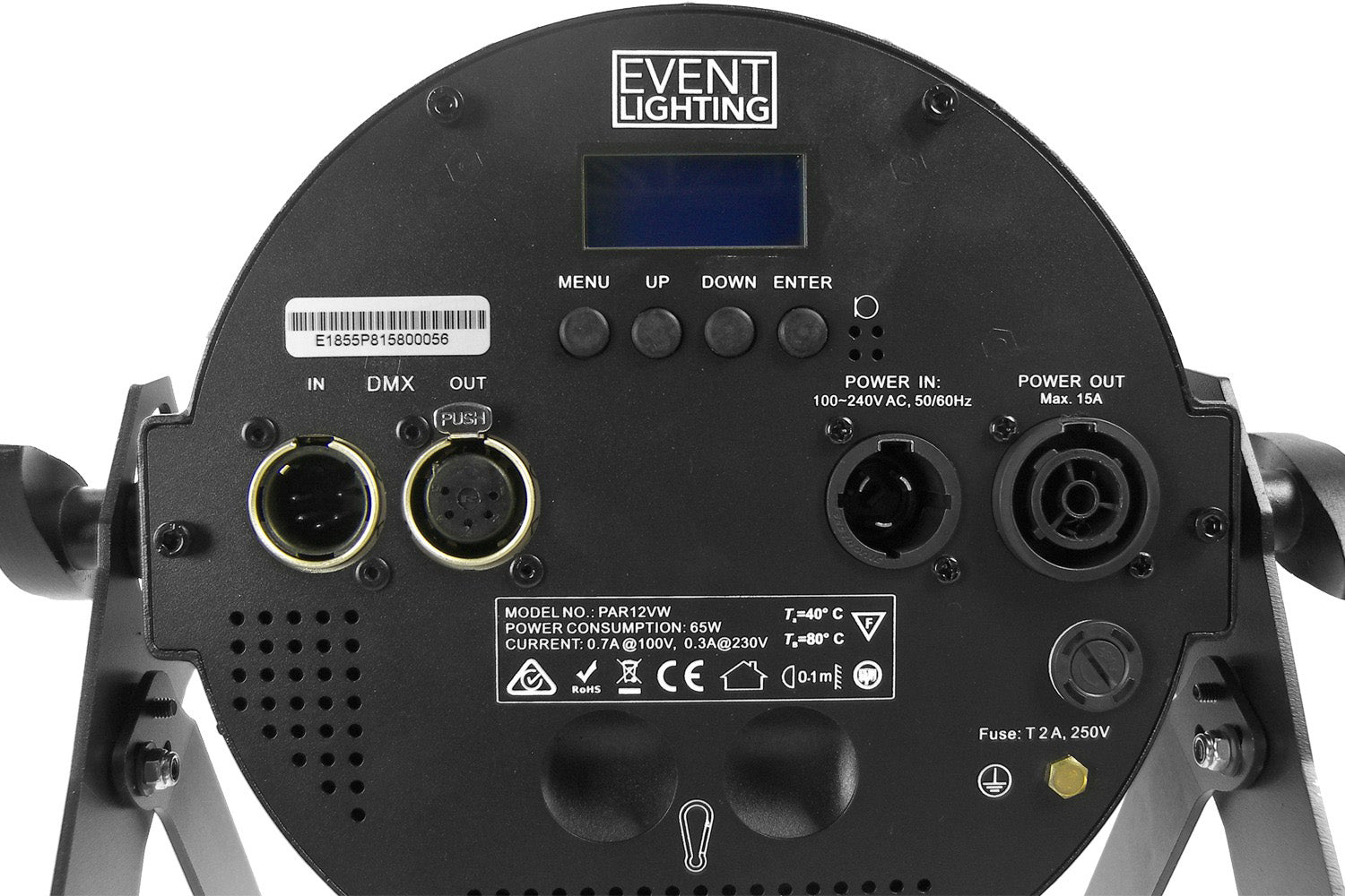 The Event Lighting PAR12VW-WH is a powerful and versatile LED Pro Parcan. With 12 x 16W CW/WW/A LEDs, it delivers Cool White, Warm White and Amber to provide the right atmosphere for any occasion. With 5 x 16-bit Dimming Curves and adjustable strobe settings ranging from 1 to 30Hz, you have full control over your lighting effects. Enjoy customisable beam angles with options for 30˚, 40˚, 25˚ and 15˚, providing the perfect spread for any application. Experience 3,270 lux output at 2.0 meters, ensuring vibrant illumination in any setting. Boasting a robust lifespan of 50,000 hours, this fixture is built to last.