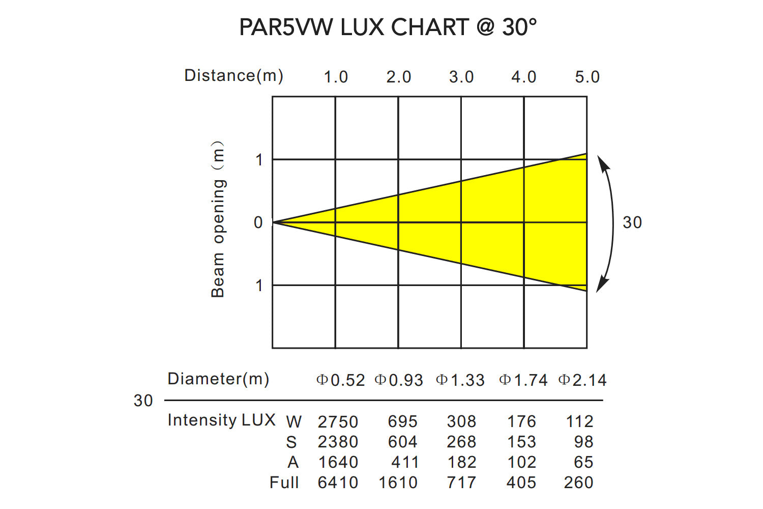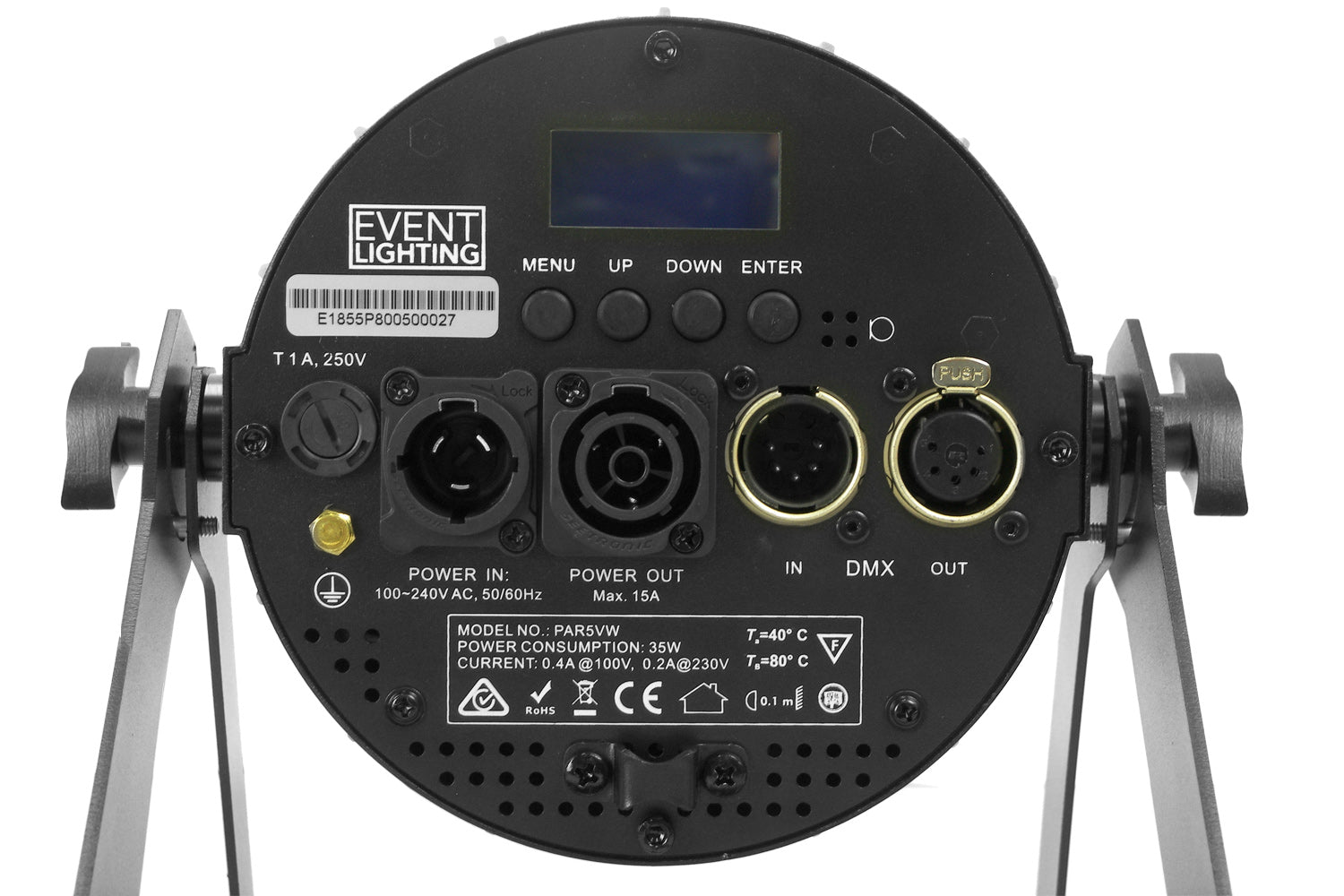 The Event Lighting PAR5VW is a powerful and versatile LED Pro Parcan. With 5 x 6W CW/WW/A 6 in 1 LEDs, it delivers Cool White, Warm White and Amber to provide the right atmosphere for any occasion. With 5 x 16-bit Dimming Curves and adjustable strobe settings ranging from 1 to 30Hz, you have full control over your lighting effects. Enjoy customisable beam angles with options for 30˚, 40˚, 25˚ and 15˚, providing the perfect spread for any application. Experience 1,610 lux output at 2.0 meters, ensuring vibrant illumination in any setting. Boasting a robust lifespan of 50,000 hours, this fixture is built to last.