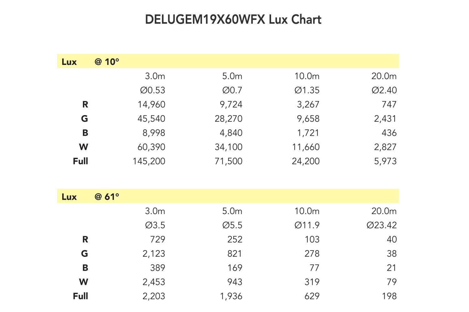 DELUGEM19X60WFX - IP65 Moving Head Zoom Wash with 19 x 60W RGBW + 76 x 0.5W RGB LEDs