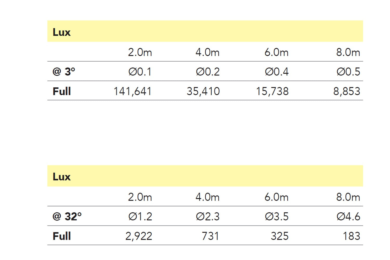 - Output: 141,641 Lux @ 2m (3°); 2,922 Lux @ 2m (32°)