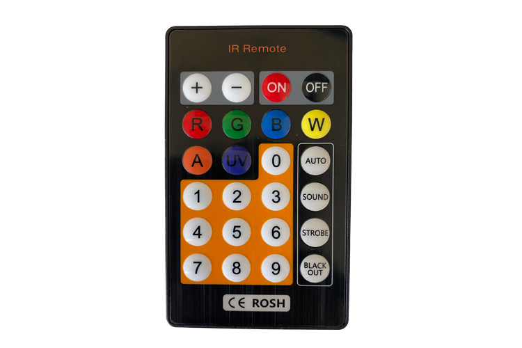- Operation Modes: DMX, manual, auto, sound active, IR remote, master/slave