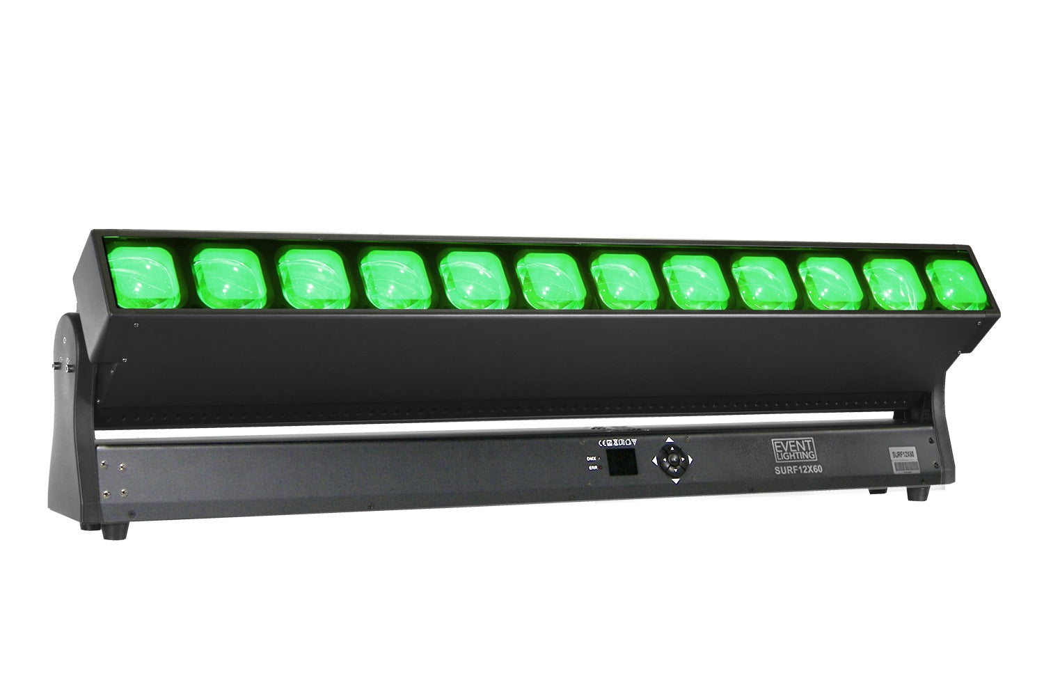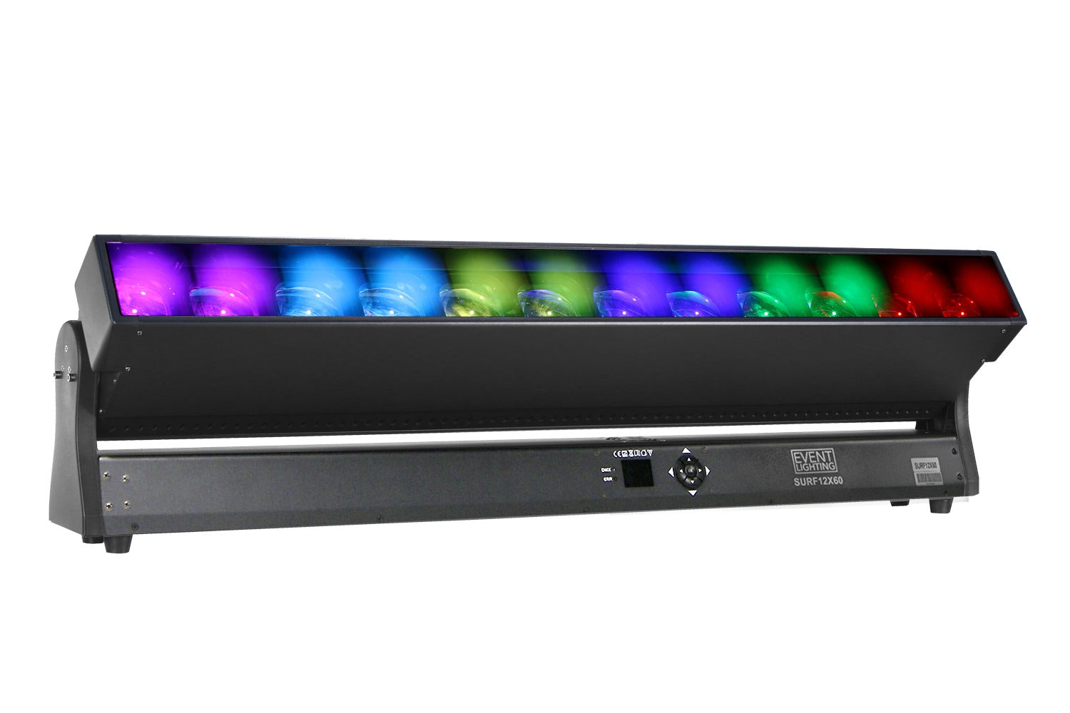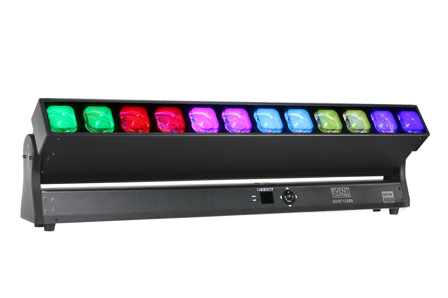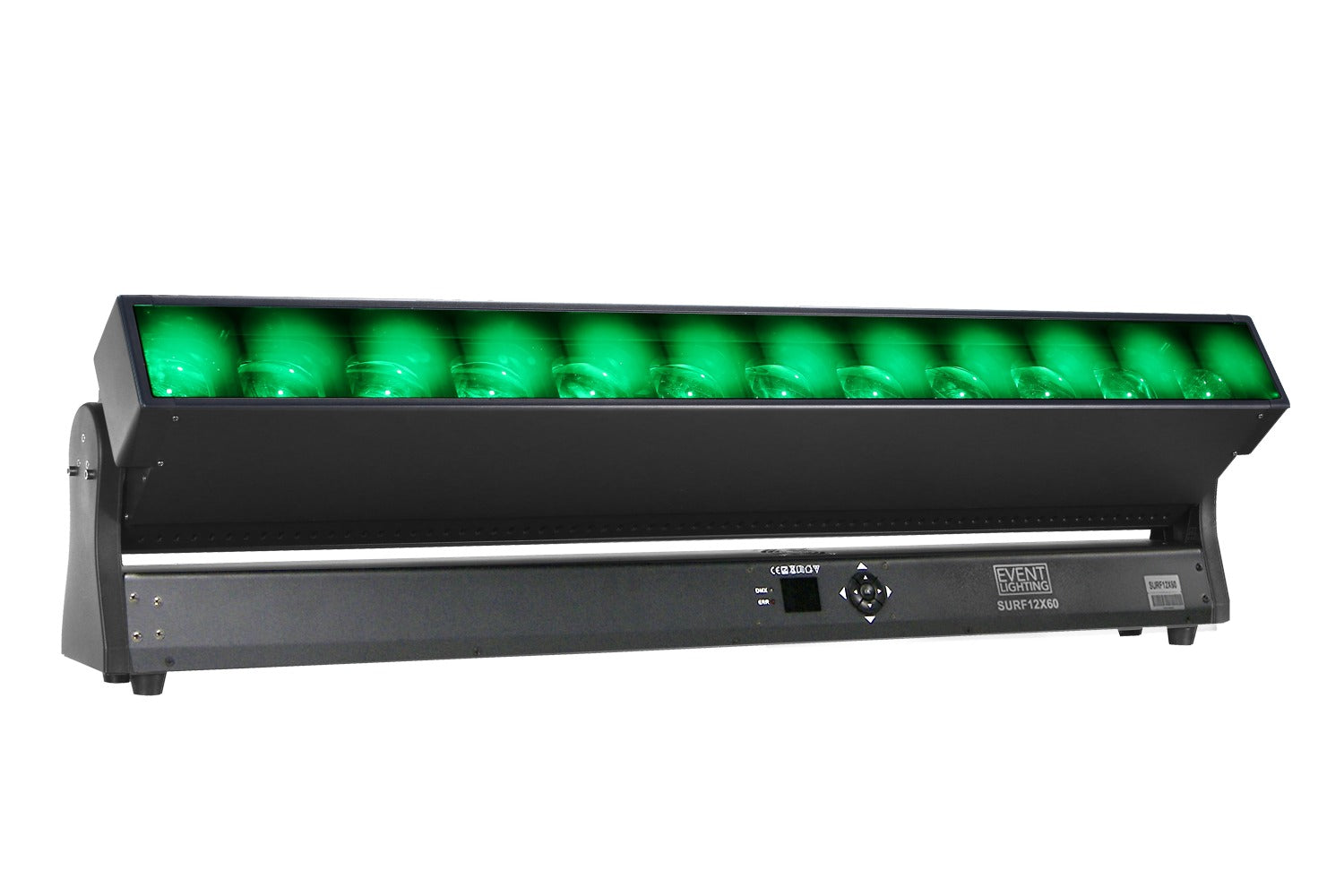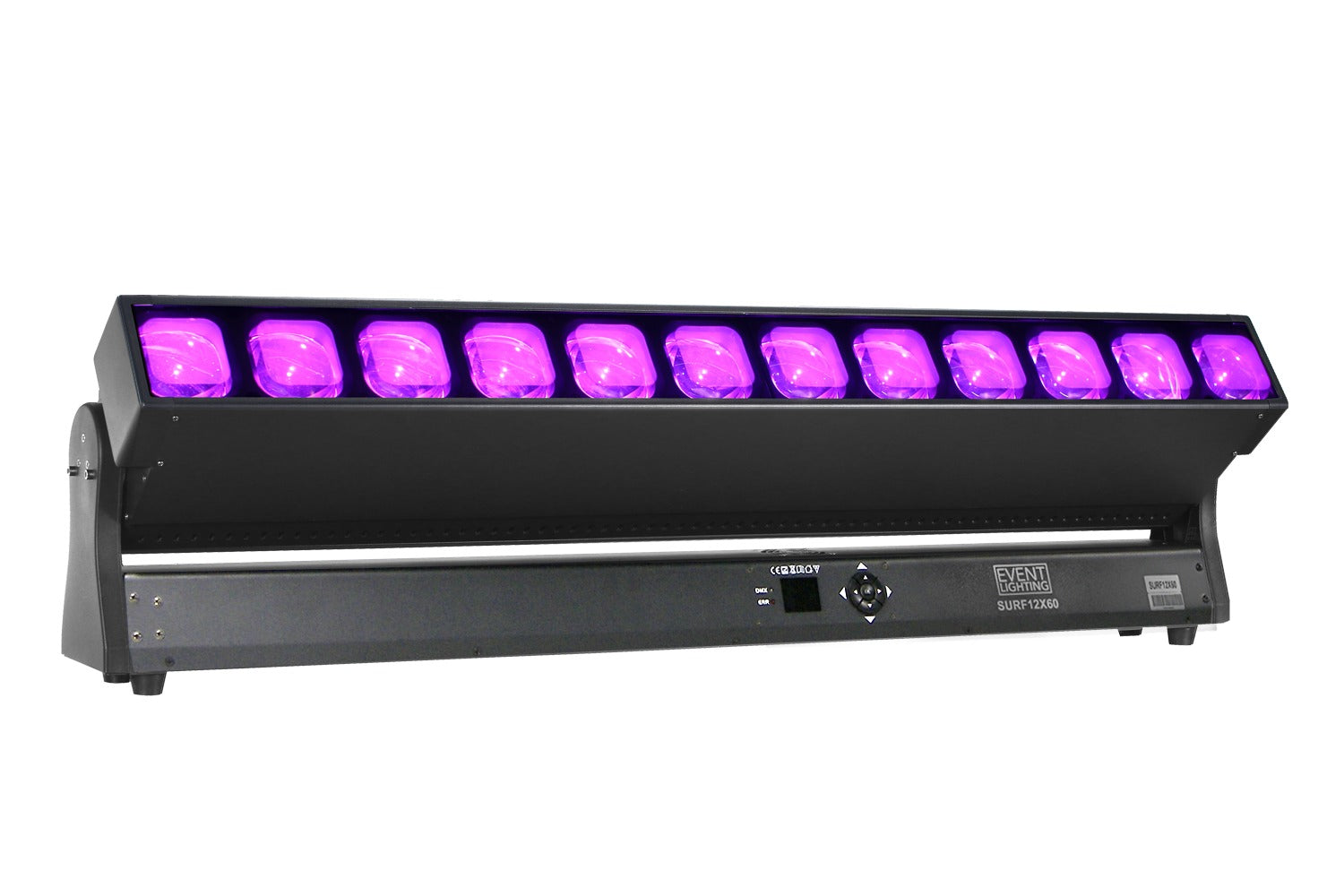 The Event Lighting SUR12X60 is a powerful tilt bar featuring 12 x 60W RGBW 4-in-1 LEDs. It offers a broad electronic zoom range from 3° to 40°, enabling versatile beam control from a tight, focused spot to a wide wash. The fixture has a 220° tilt movement and multiple control modes including DMX, auto, and sound active. With a robust aluminium housing and True1 in/out power connections and 5-Pin XLR connections, the SUR12X60 is a reliable and professional lighting solution.