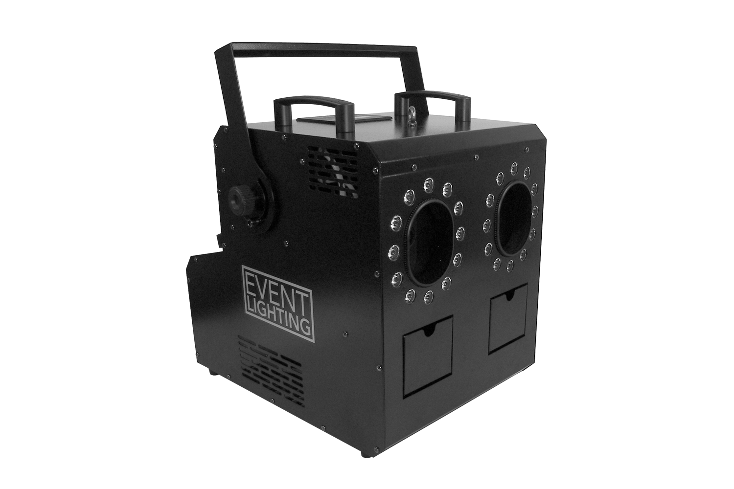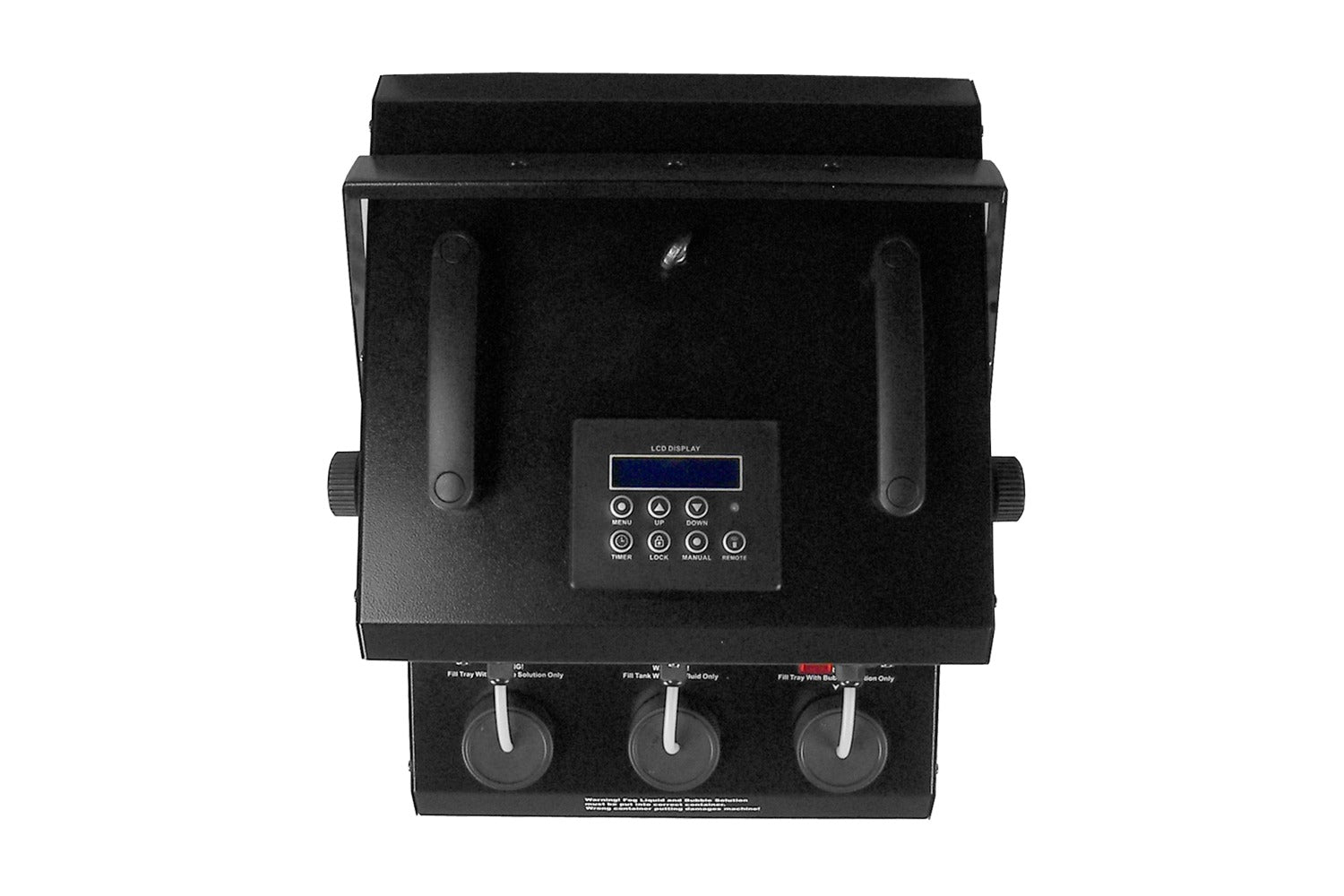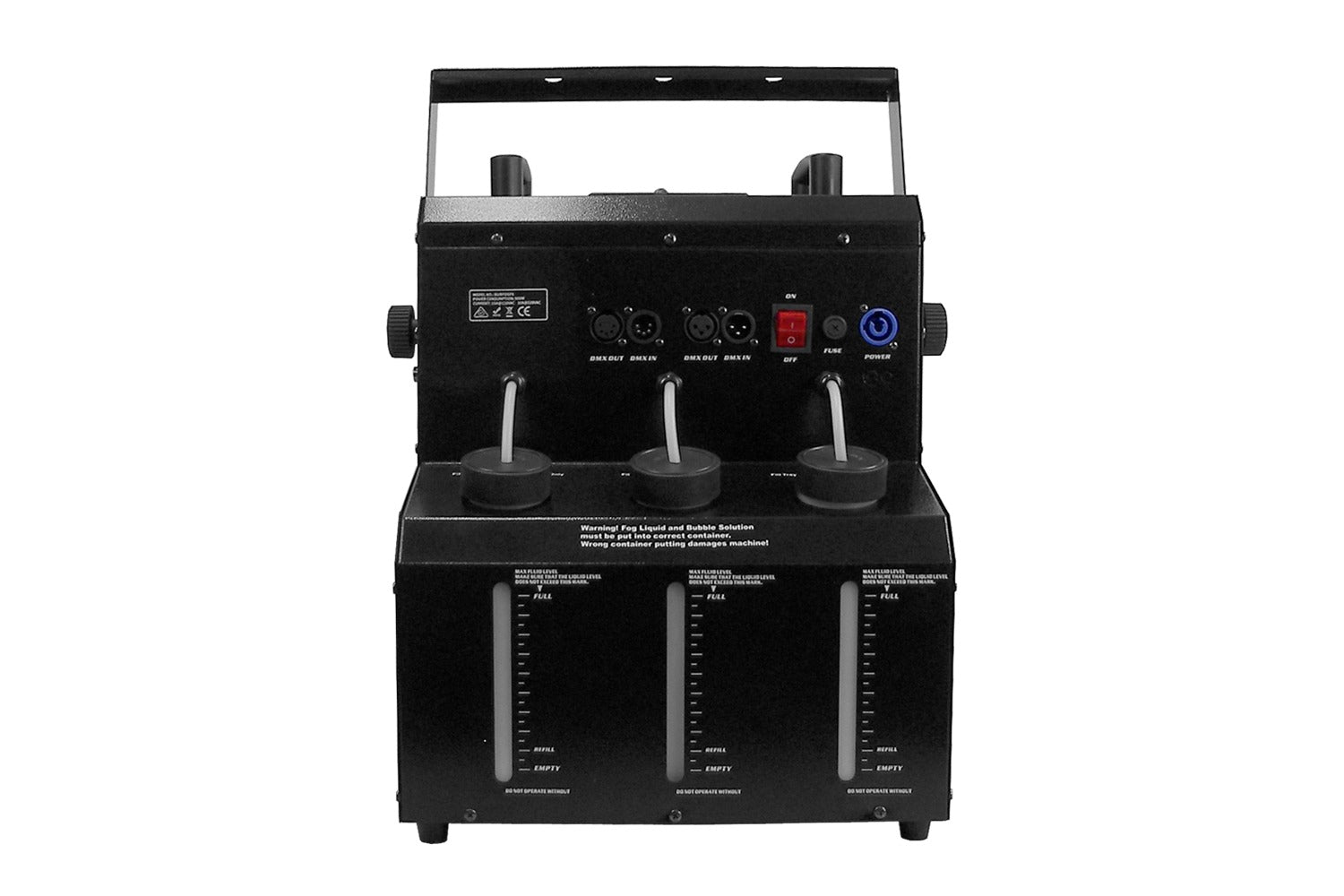 Hybrid Bubble & Fog Machine with 1,500W Heating Element, Dual Outputs, 48 x 3W RGB+W LEDS, 3 Pin DMX in/out, Powercon input, On-Board Manual Control, 1 x Fog/2 x Bubble Tanks (2.3L each), Wireless Remote and hanging bracket included