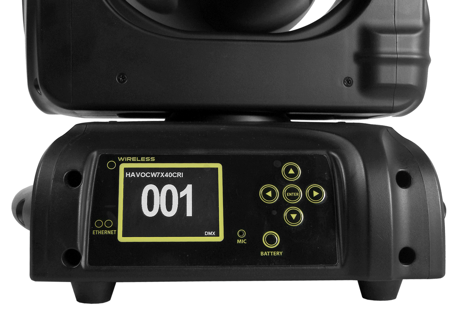 With flexible operational modes including DMX, auto, and sound active, navigation is intuitive via the 2.4" colour LCD control panel with battery backup. Upgradeable via DMX, the HAVOCW7X40CRI ensures your lighting capabilities stay cutting-edge. Crafted with durability in mind, the matte black ABS and steel housing contains a sensor-controlled fan, ensuring efficient cooling in a robust and reliable form-factor.