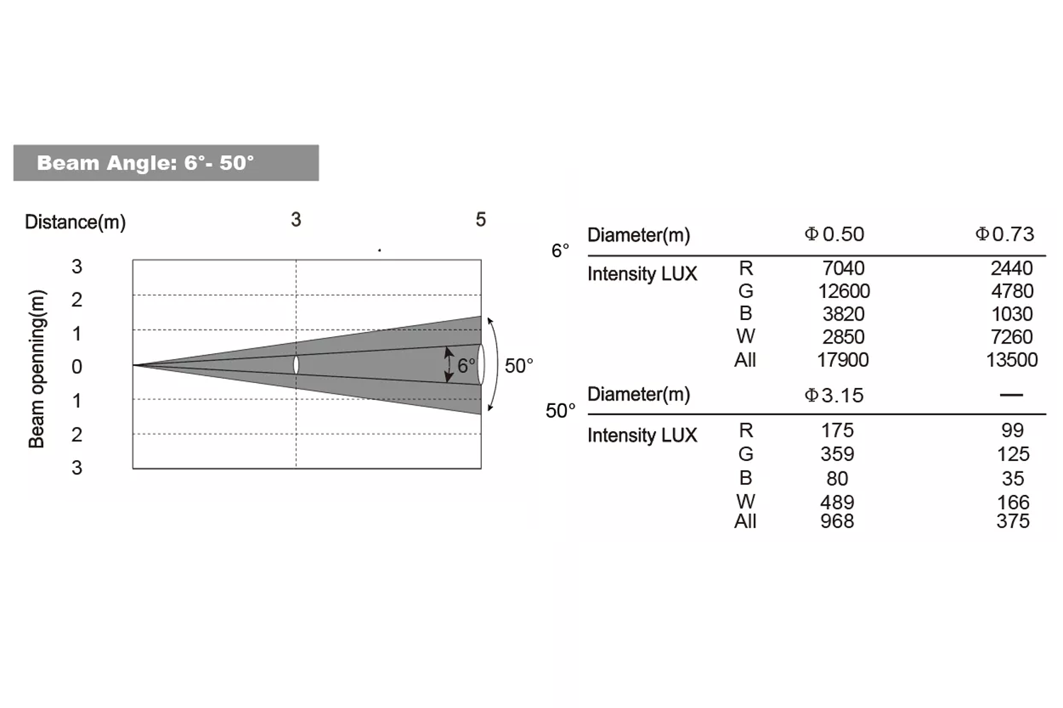 - Output: 4130.4 lumen,(6°) 46110 lx - (53°) 3931 lx@all@3m
